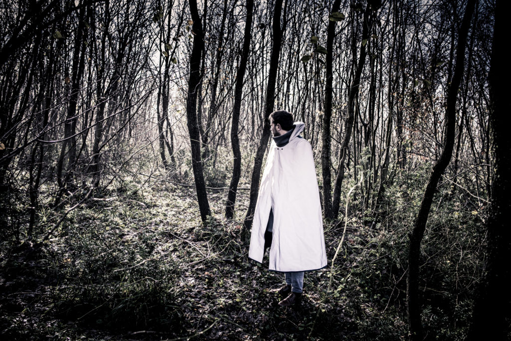 En collaboration avec deux jeunes designers de la HEAD – Genève, nous avons conçu un costume pensé pour le déplacement : un manteau en laine, une cape réversible (bleu nuit d’un côté, tissu réfléchissant de l’autre), et un pantalon. Mon seul bagage était une sacoche contenant mes sous-vêtements – une manière de rester mobile tout en conservant une certaine rigueur corporelle. Ce costume, que j’imaginais comme un habit multifonctions, jouait le rôle de vaisseau spatial personnel, me permettant de traverser les paysages avec autonomie.